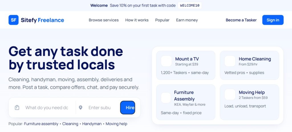 Build your own Airtasker-like platform where people can post tasks and skilled professionals can bid to complete them. This readymade Airtasker clone WordPress website gives you everything you need to launch a profitable on-demand service marketplace — ready in 24 hours with your .com domain, 1-year premium cloud hosting, complete Airtasker-style development, a proven marketing strategy, the Sitefy Success Kit, and a 1-on-1 growth hacker session for business success.